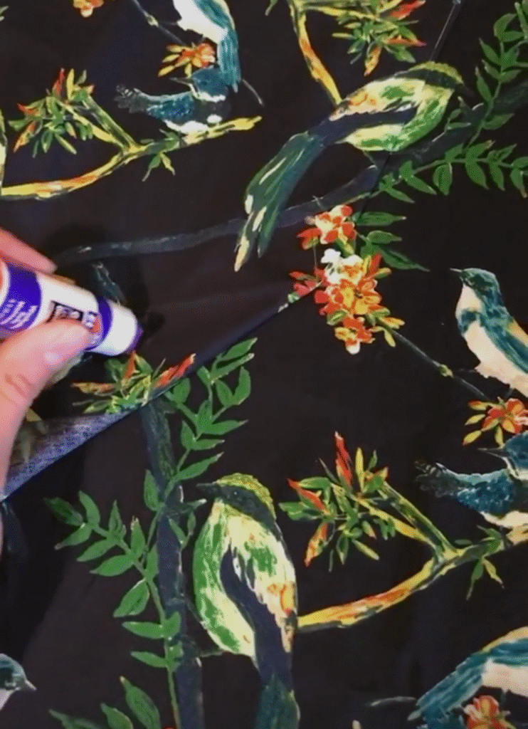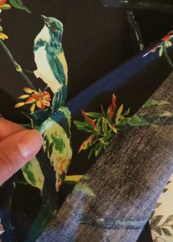 Place the folded edge of the fabric on top of the fabric you’re matching to, ensuring that the repeat lines up throughout the whole seam. Make sure to finger press everything in place before ironing it to set the glue. Iron firmly with a dry setting and let dry.